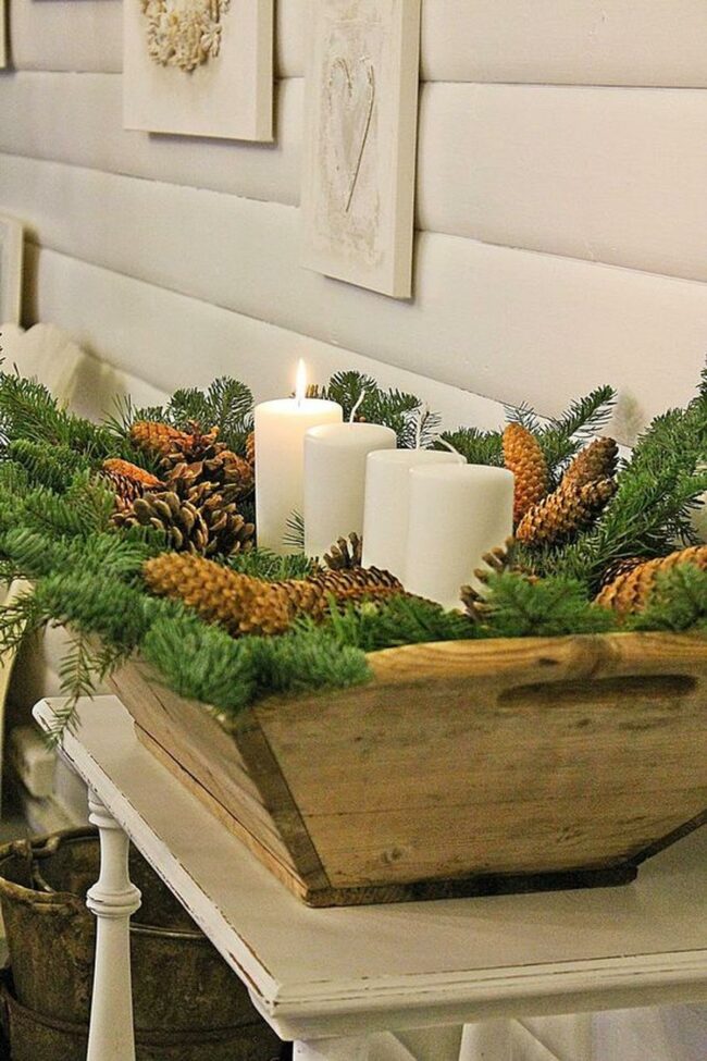 Tall white candles rest on wooden trays surrounded by green pine branches and large pinecones, creating a rustic centerpiece.
