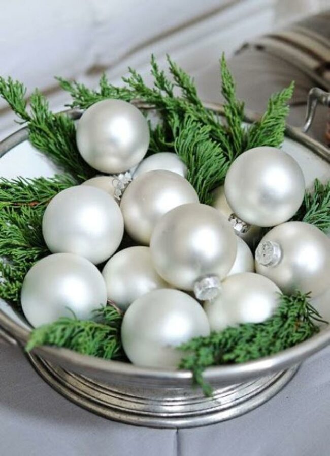 Silver, gold, and pearl-toned spheres gleam from a pristine white ceramic bowl, creating an enchanting display that draws your eye.