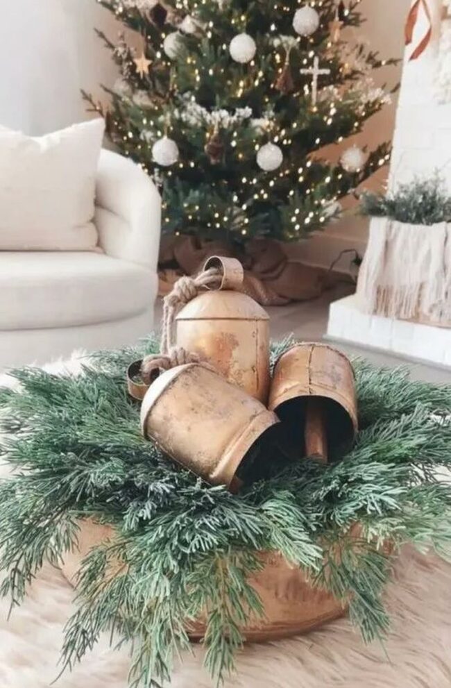 Clean white pottery pieces with gentle curves complement the metallic bells and green branches.