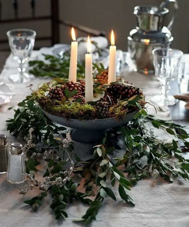 Gentle white candles flicker among the greenery, casting a warm and welcoming glow.