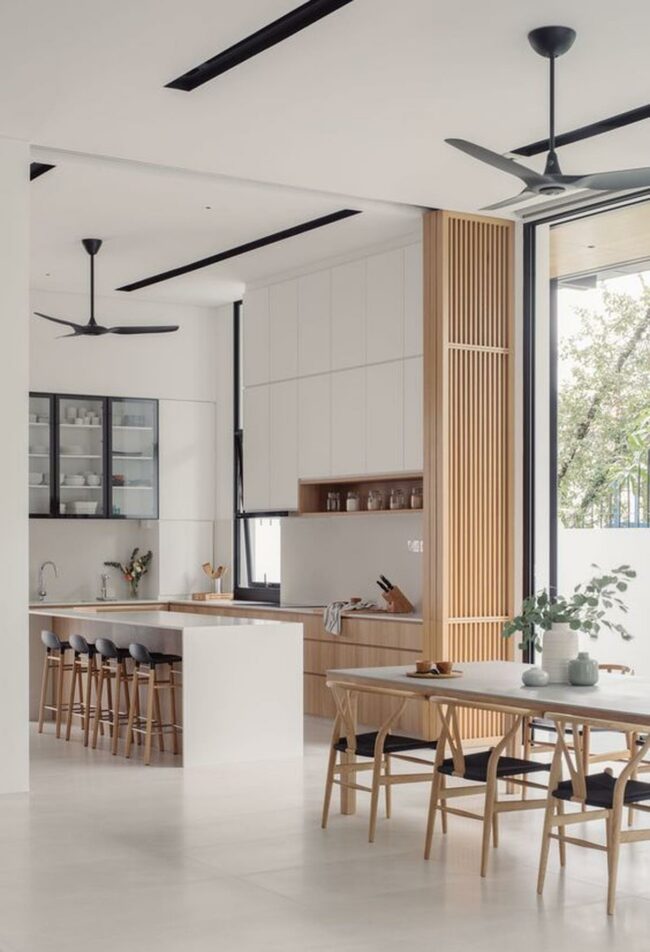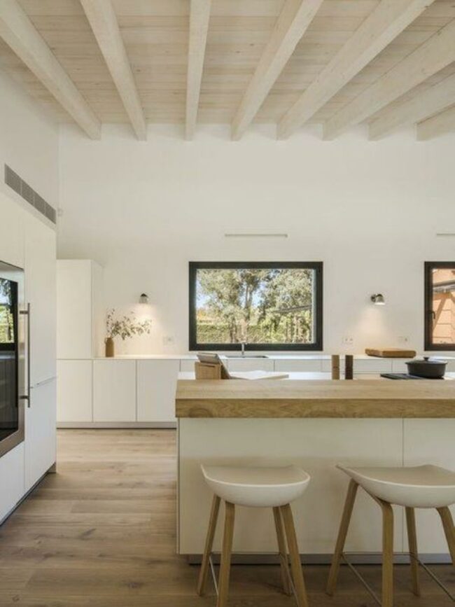 White kitchen cabinets contrast beautifully with rich wood surfaces, creating a balanced and calm atmosphere.