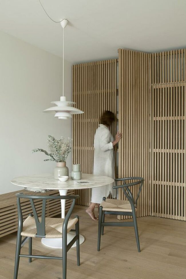 Vertical wooden slats on the wall add depth and visual interest without overwhelming the space.