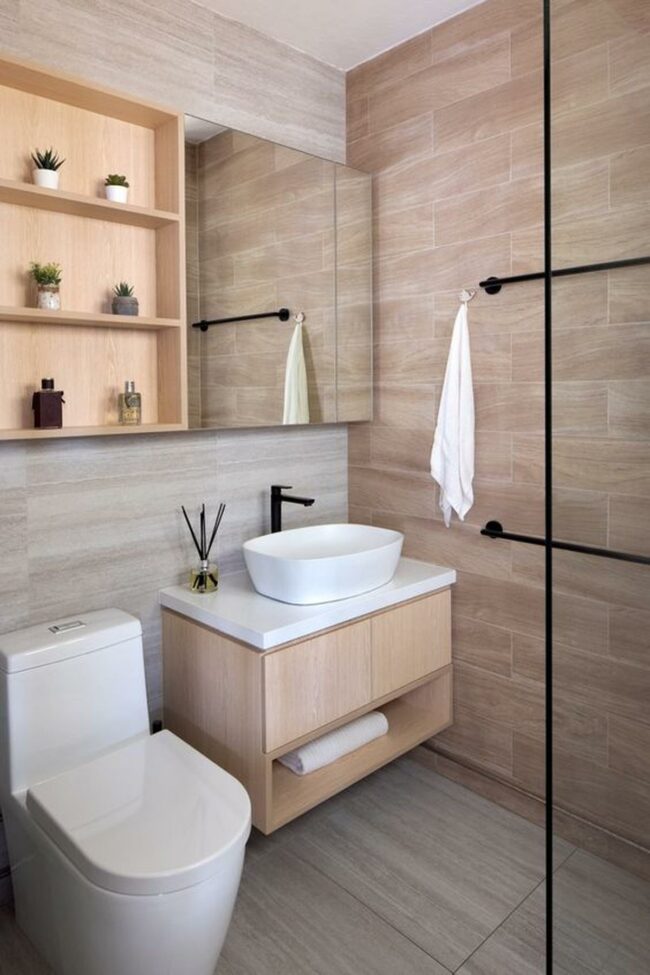 Wooden vanities with open shelves display rolled towels elegantly, while built-in wooden shelves showcase small potted plants and decorative bottles.