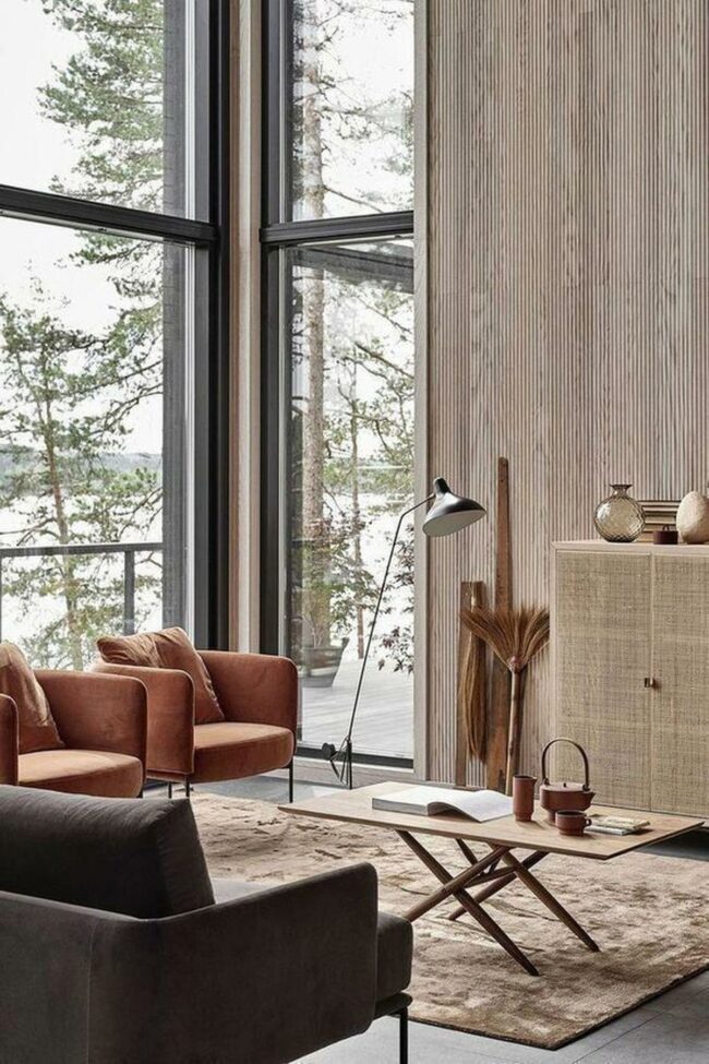 Tall trees outside create a serene backdrop for this warm, inviting space.