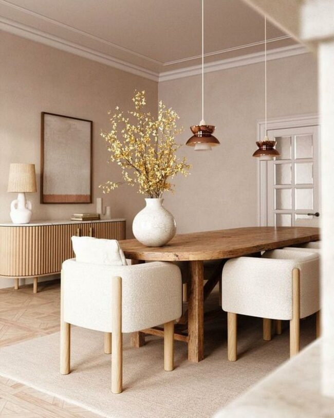 Soft beige walls embrace a large wooden table that anchors the space with natural elegance.