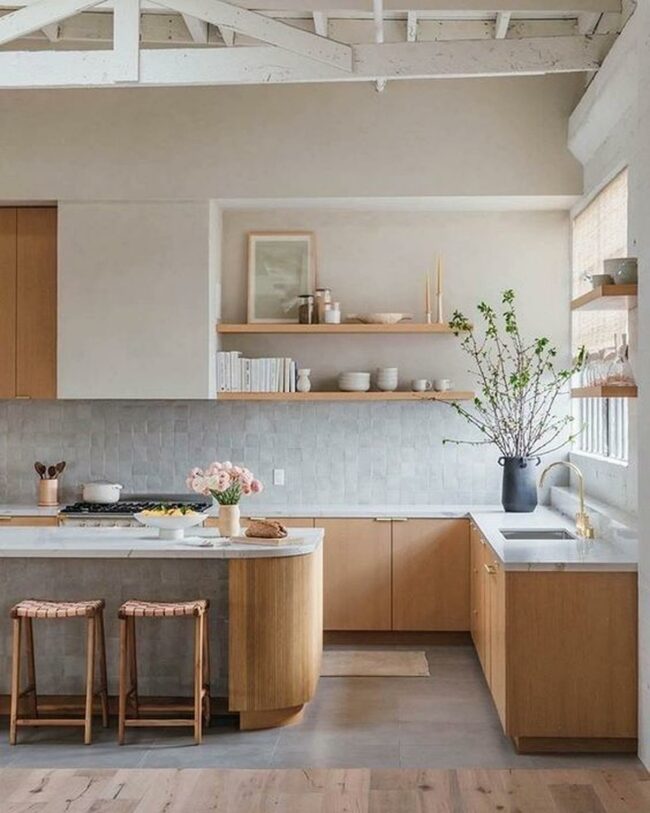 Open shelves showcase a few carefully selected bowls and books, adding personality without overwhelming the space.