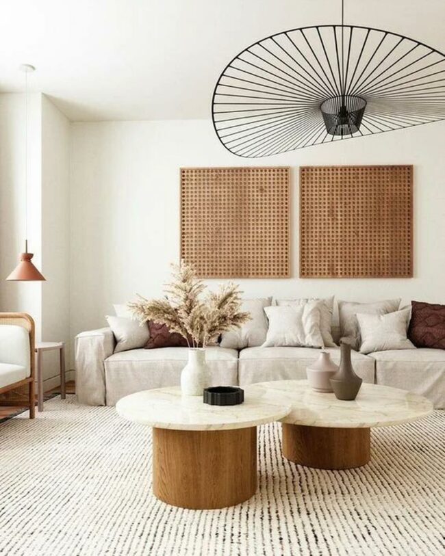 Wooden-based round coffee tables with marble tops anchor the room's center, displaying minimalist vases and a small black dish.