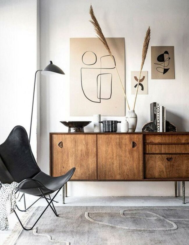 White vases with dried plants perch atop the cabinet, introducing vertical dimension and texture.