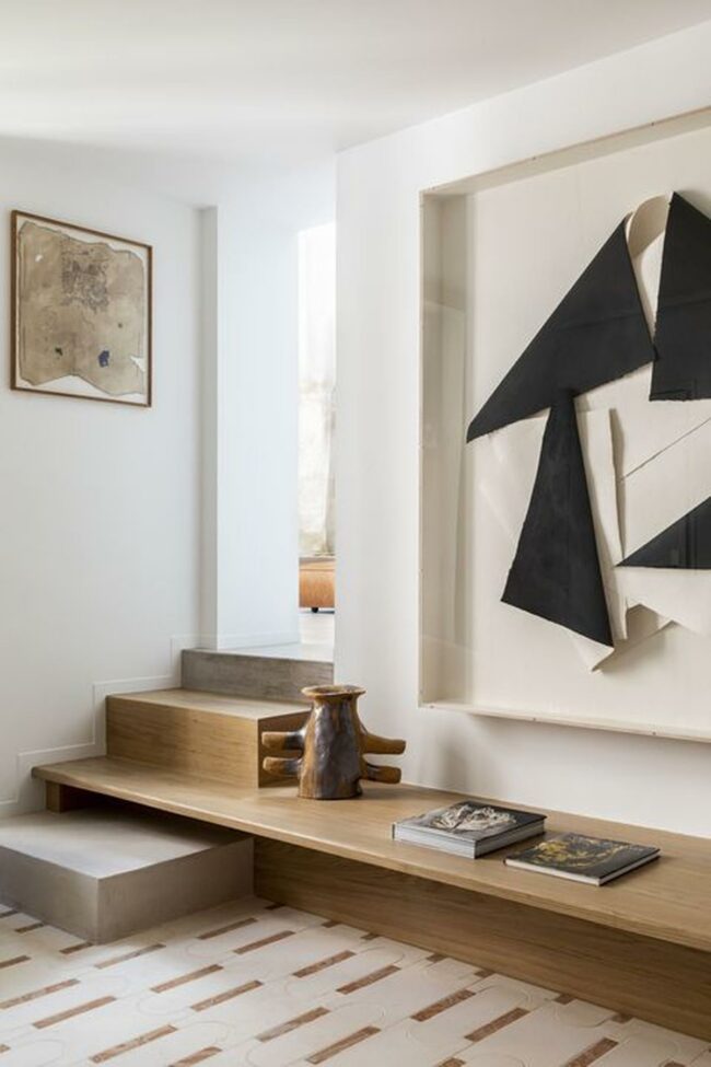 Low wooden benches hold delicate decorative touches like small carved sculptures and selected books.