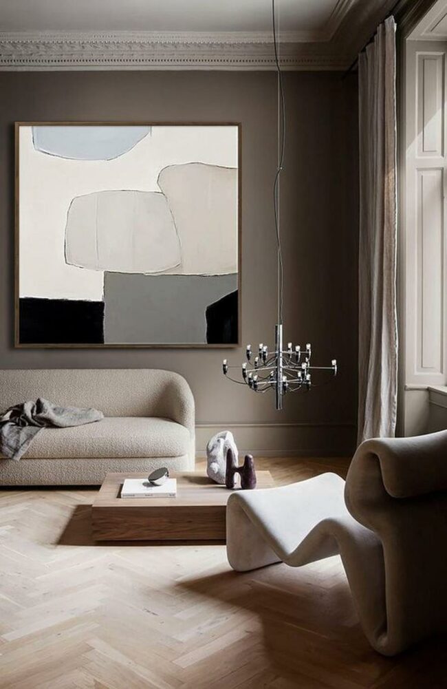 Black and beige modern art draws immediate attention from one wall, breaking the neutral palette with dramatic contrast.