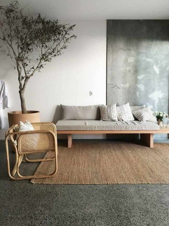 Textured rugs provide warmth against smooth concrete walls, enhancing visual depth.