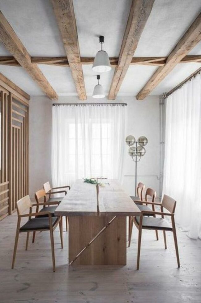 Wooden elements dominate the space, from warm-toned floors to overhead architectural beams that guide your gaze.