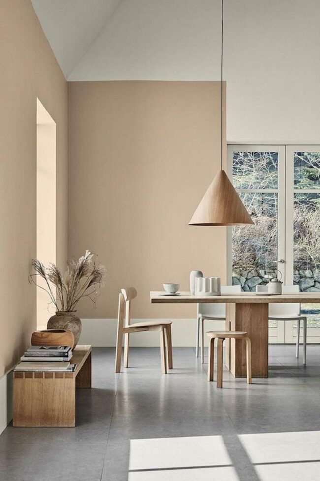 Dining spaces feel calm with light beige walls and simple wooden furniture.