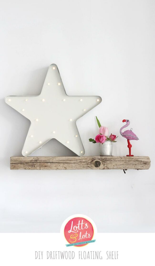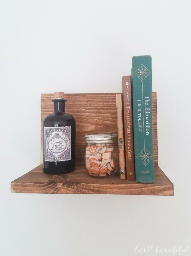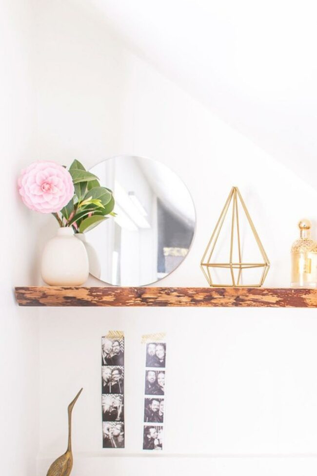 Natural wood tones with rough edges give the shelf an authentic, lived-in feel.