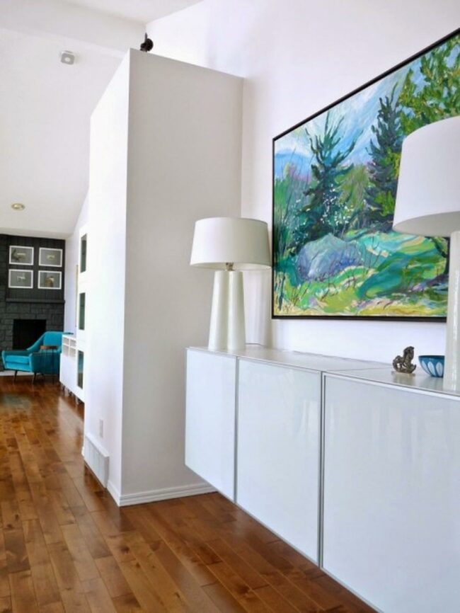 Simple elegance defines the room with a flat-screen TV positioned perfectly above the cabinet, creating a clean visual line.