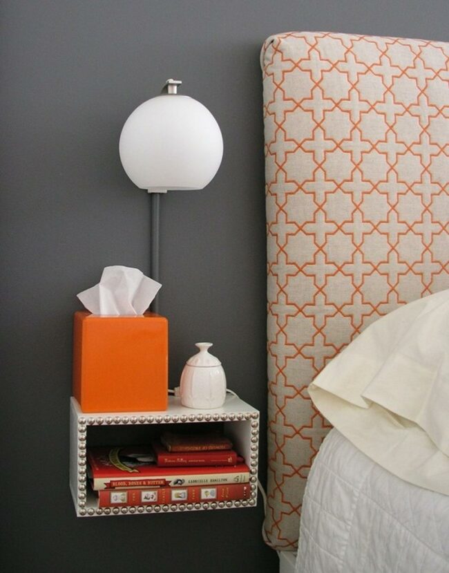 Geometric orange fabric adorns the headboard, perfectly matching a vibrant tissue box nearby.