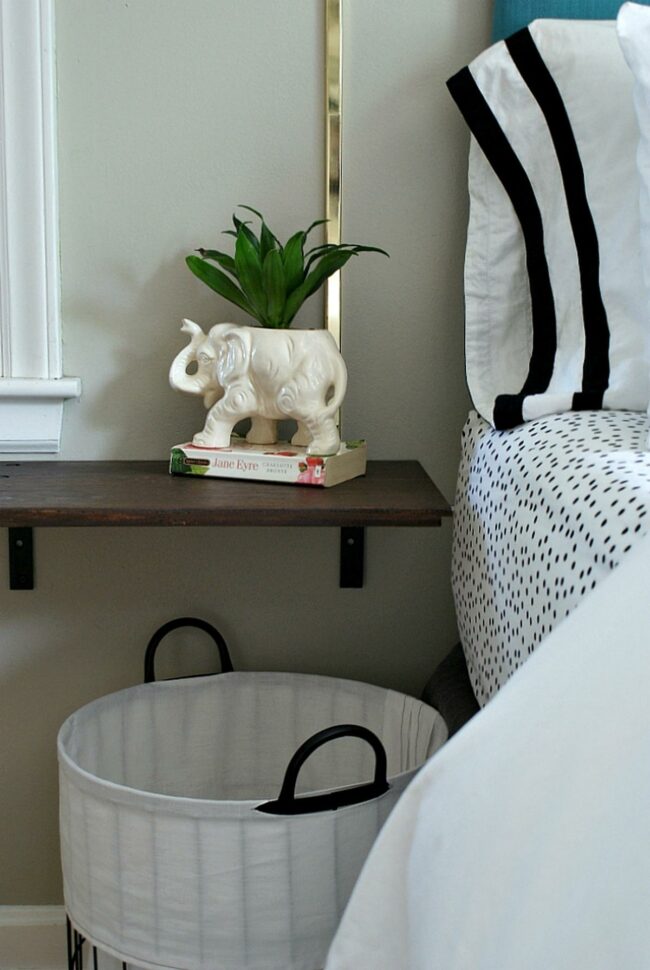 Small wooden shelves display charming details like a white elephant-shaped planter with green leaves.