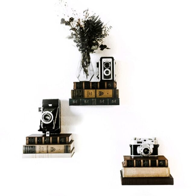 Vintage camera and book shelves are a nostalgic display that transforms a white wall into a personal museum.