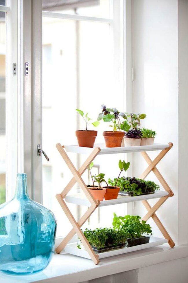 Wooden pots display long leaves and delicate flowers in neat rows along the window.