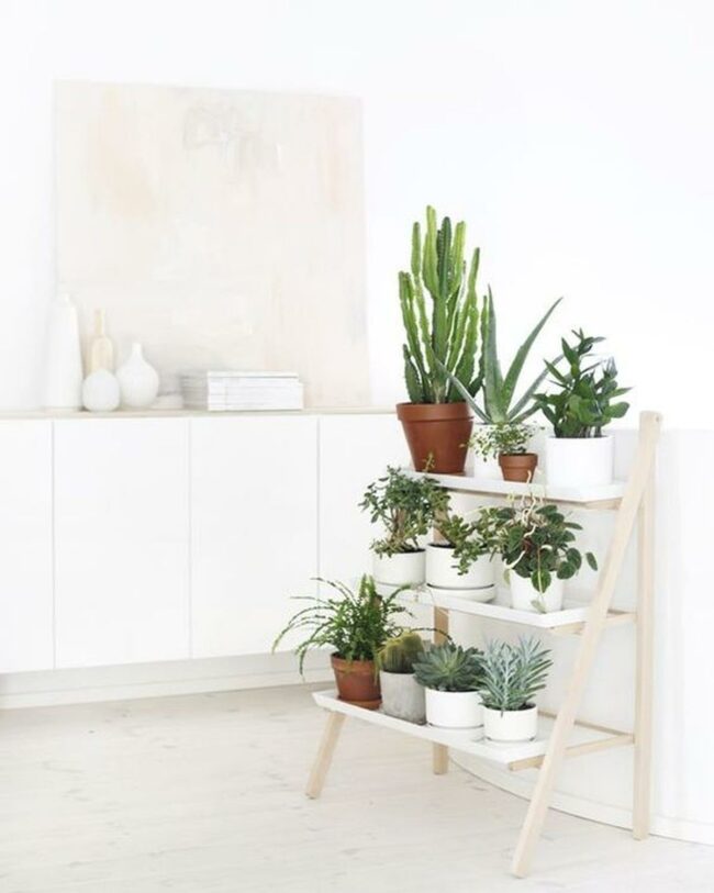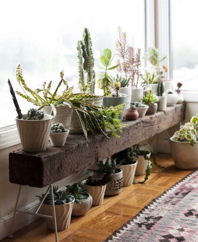 Simple shelving allows each plant to shine, turning an ordinary wall into a vibrant botanical showcase.