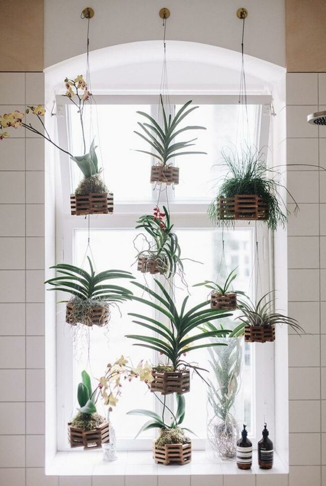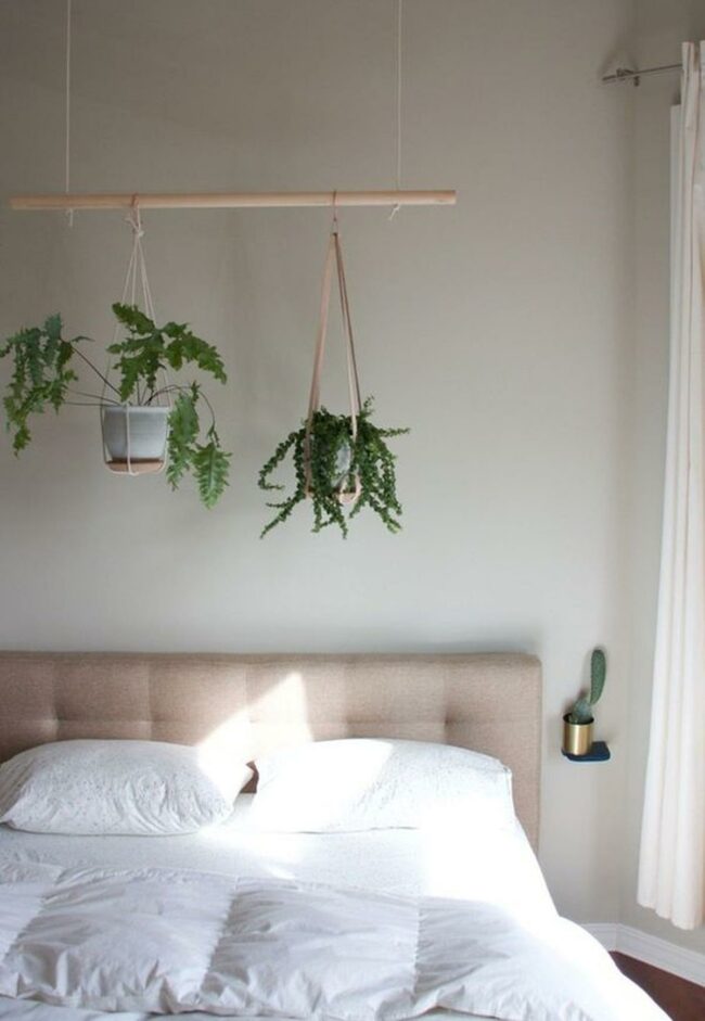 Green plants hanging from a wooden rod add organic life to the calm environment.