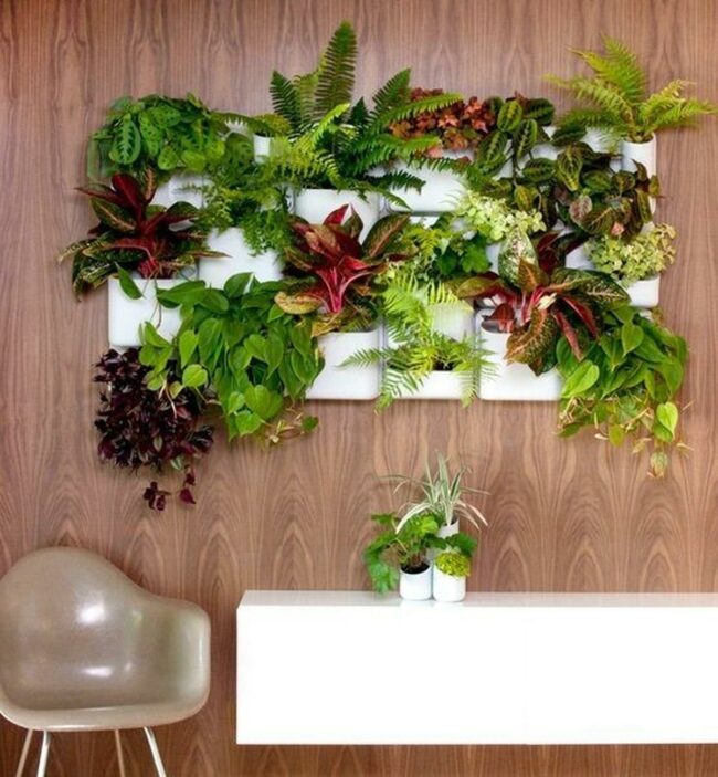 Wooden wall surfaces provide a natural backdrop that enhances the plant display.
