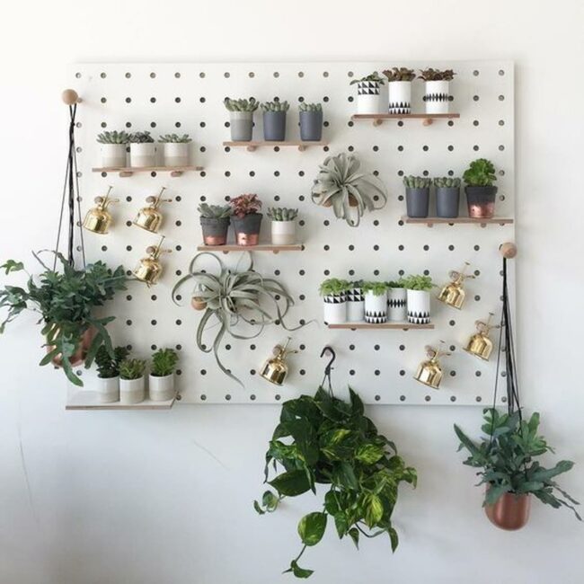 Plant displays sparkle with personality on this white pegboard, creating a lush indoor garden that feels both organized and welcoming.