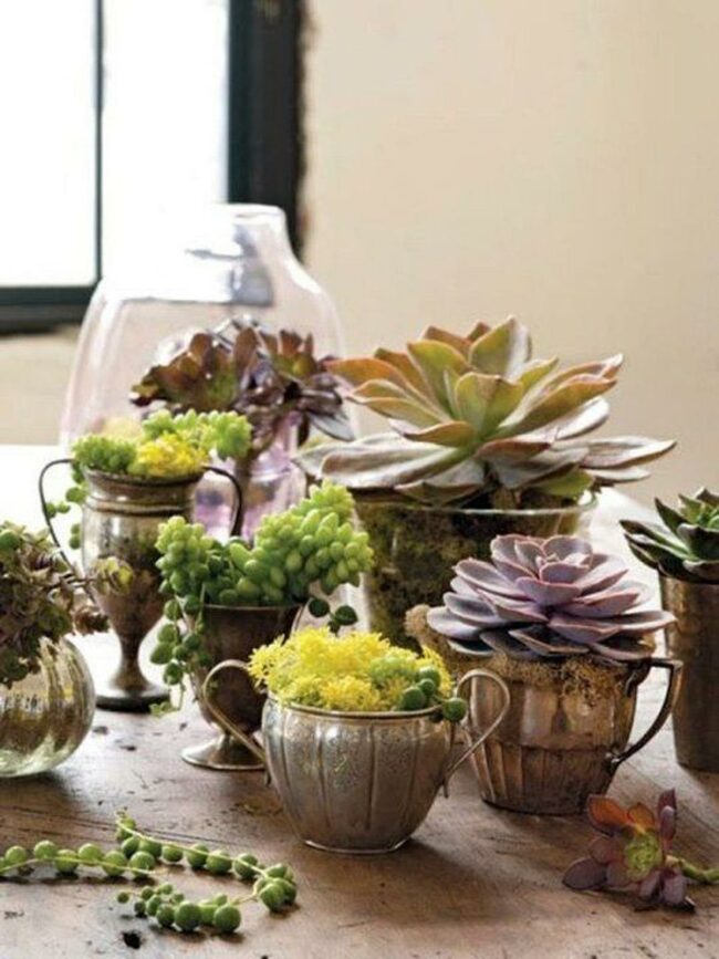 Green and purple plants sprawl across a rustic wooden table, nestled in shiny silver cups and small pots.