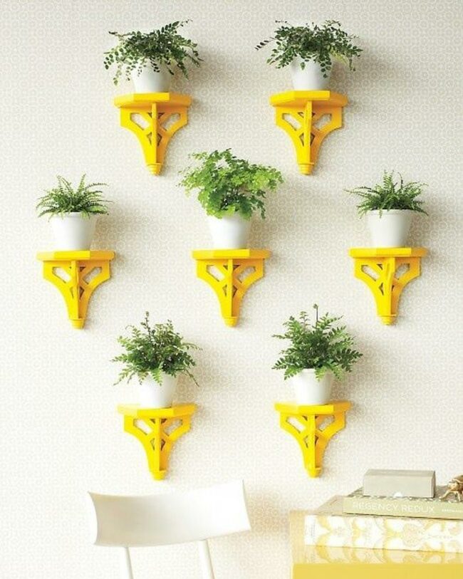 Yellow shelves are the eye-catching centerpiece of this delightful interior design, showcasing small white pots brimming with lush green plants that breathe life into the wall.
