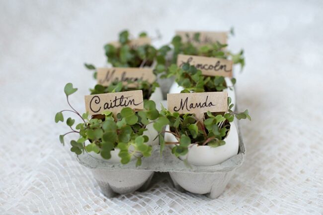 Brown paper name tags peek out beside tiny fresh leaves, adding a personal touch to this delightful display.