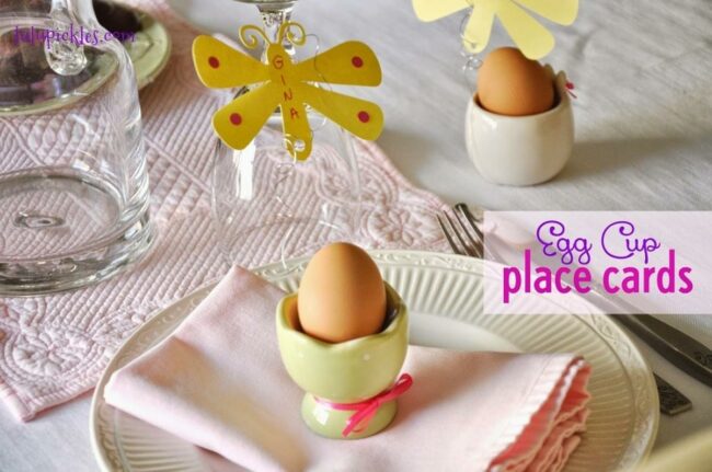 Brown eggs nestled in small egg cups add a charming and unexpected twist to the place cards.