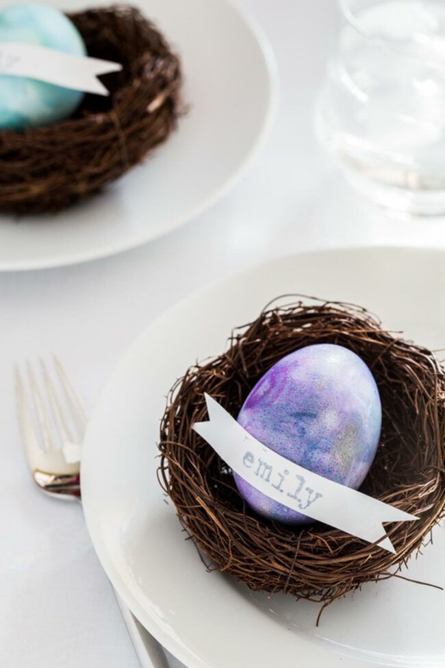 Natural materials like twigs and moss create elegant foundations for porcelain or painted eggs.