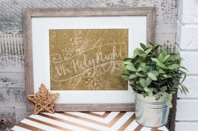 Glittery gold lettering on the framed sign brings unexpected sparkle and cheerful energy.