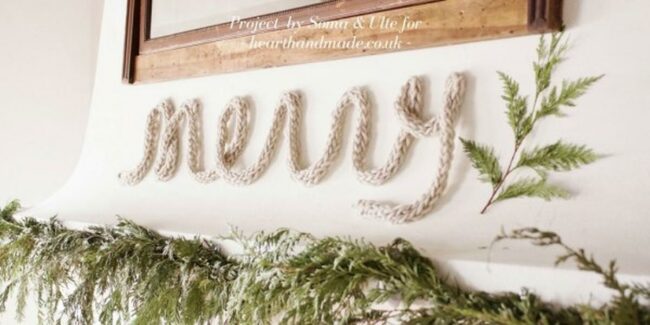Thick rope letters spelling "merry" add a charming, handcrafted accent to white walls.