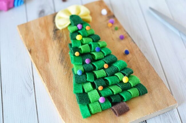 Green felt pieces form the tree's festive silhouette, layered with charming precision.