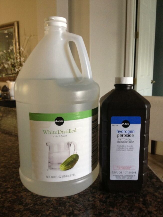 Dark brown hydrogen peroxide and clear vinegar create a simple but strategic cleaning duo.