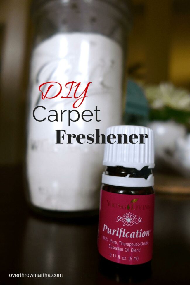 Purification essential oil and white powder are key ingredients for an effortless homemade carpet freshener.