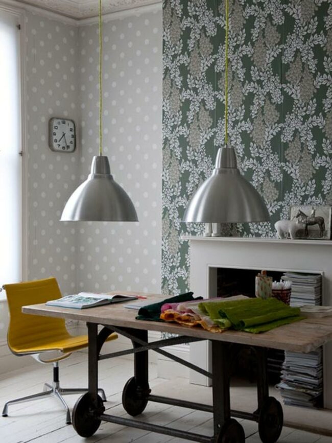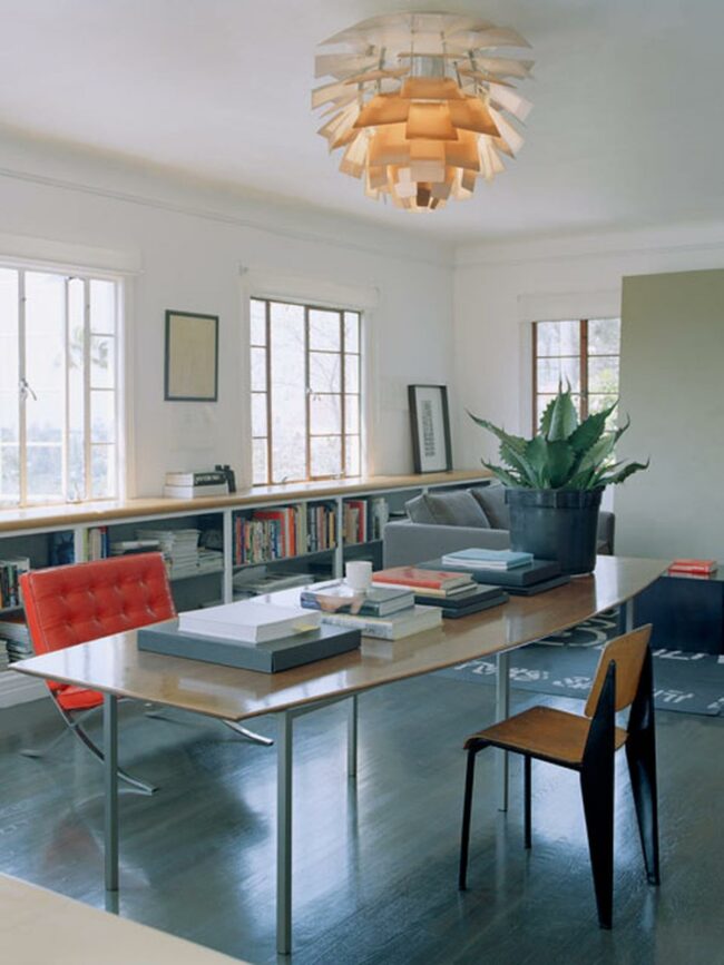 The classic black lamp stands ready to provide extra light when evening comes, while green vases add touches of nature among scattered papers.