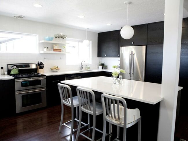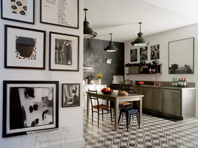 Our modern kitchen blends black, white, and gray tones with eye-catching geometric floor tiles that immediately draw attention.