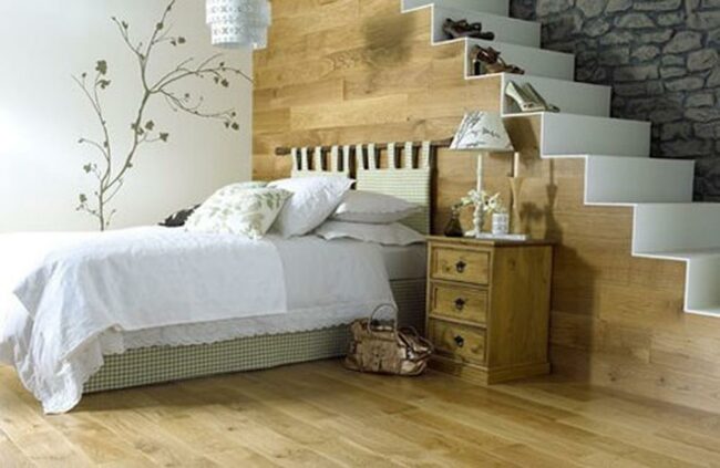 Wooden floors and a matching paneled wall create a warm backdrop in this restful bedroom where comfort meets simplicity.