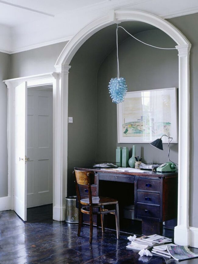 Natural light streams through the window of this charming gray-walled workspace, making the dark wooden desk and shiny floorboards glow with warmth.