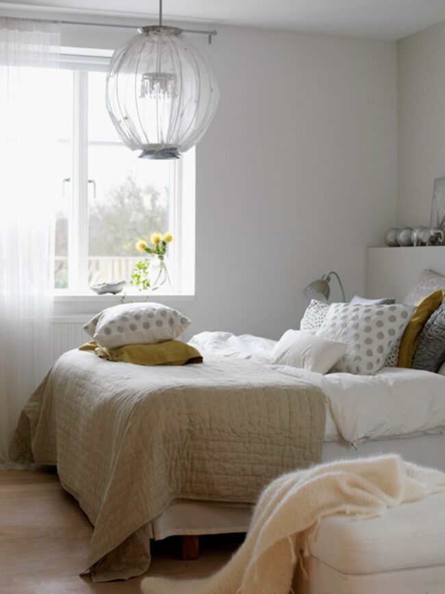 The round glass pendant lamp dangles gracefully above the bed, its simple design adding just enough elegance without overwhelming the space.
