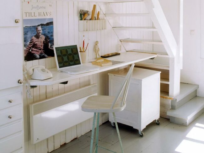 Tucked smartly beneath a white staircase, this modest workspace makes brilliant use of an otherwise wasted area.