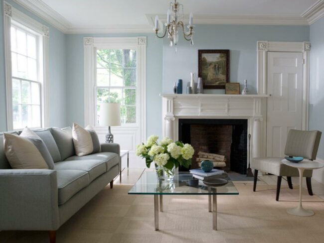 Modern blue walls create a peaceful backdrop in this refreshing living room where a glass-top table showcases lovely white flowers at its center.