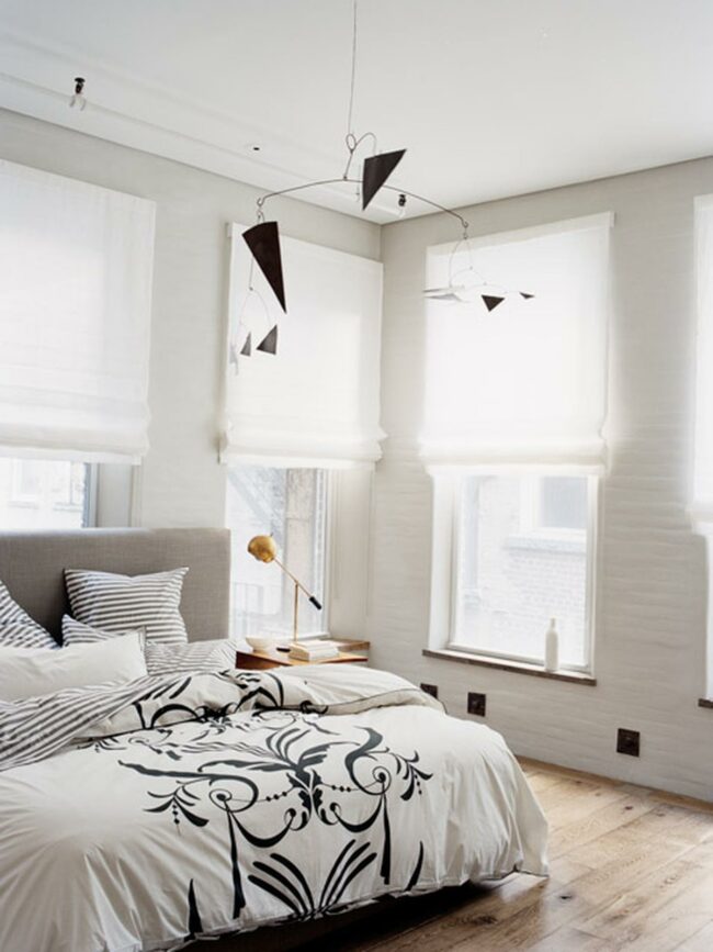 Light streams through three large windows adorned with white Roman shades, creating an airy feeling in this stylish bedroom.