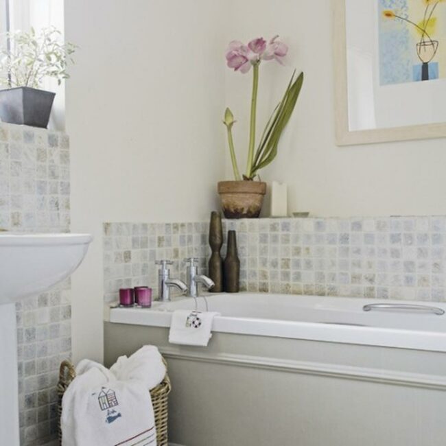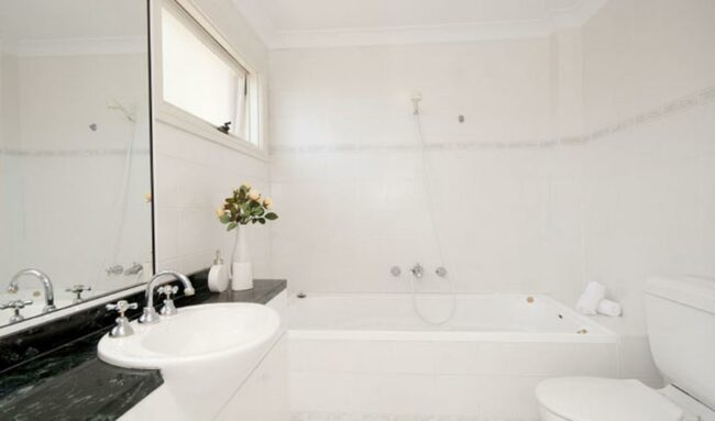 Dazzling white walls and tiles create a pristine sanctuary that seems more spacious thanks to the large mirror reflecting light throughout the room.