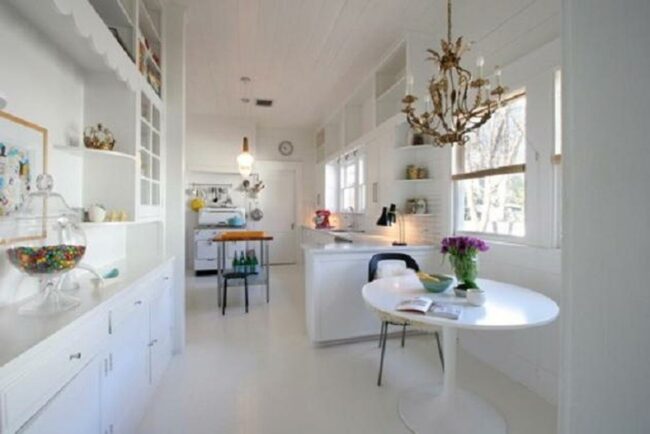 White floors and cabinets maximize the sense of space, making even a modest kitchen feel more generous.