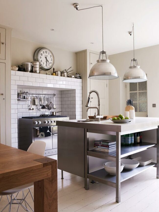 Two oversized silver pendant lights hover above a stainless steel island adorned with colorful bowls, cookbooks, and glass bottles that catch the light.