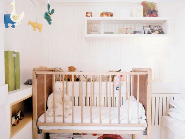 Several stuffed animals nestle inside a basket near the bed, ready for cuddles whenever needed.