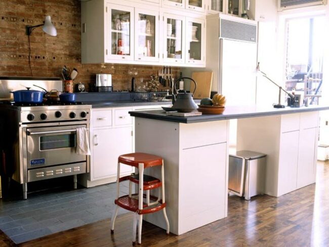 Modern kitchens become more inviting when white cabinets meet exposed brick walls for a perfect balance of clean and rustic charm.